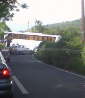Bws yn ceisio troi i’r dde i gyfeiriad Bow Street ac yn methu – 5 o’r gloch Nos Fercher 5 Gorffennaf 2009.
